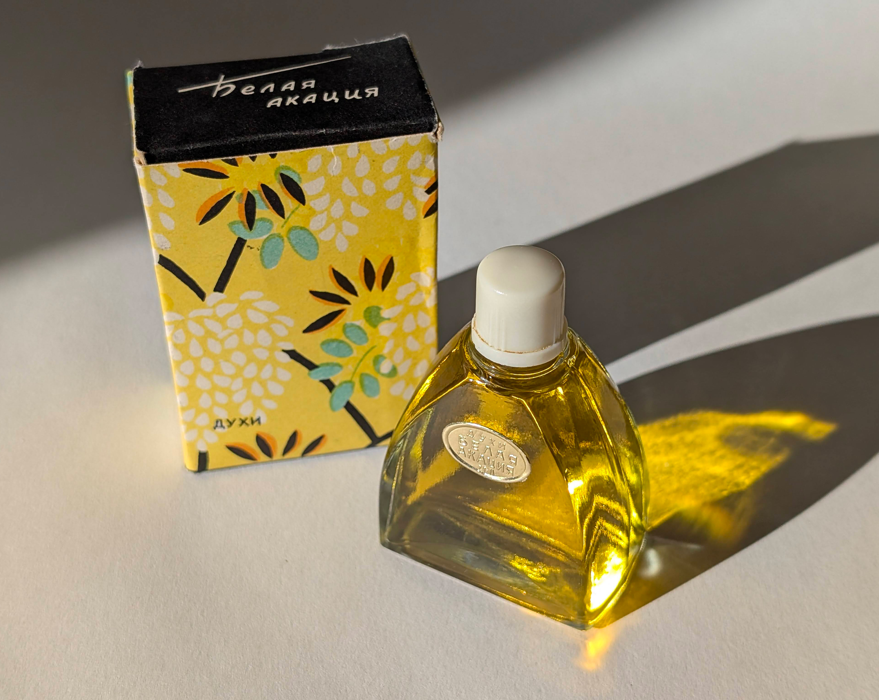 フローラル・アルデヒドやレザーのコンポジションで有名な Severnoye Siyaniye(Northern Lights)工場で White Acacia が作られたことには、今でも驚かされます。さらに言えば、その甘さゆえに一部の同時代人から下品だと見なされていた White Acacia の生みの親は、洗練されたフレグランス "Belaya Siren" (White Lilac) や "Serebristiy Landysh" (Silvery Lily of the Valley)、そして絶品のレザー香水 Opera を生み出した Bella Goutzeit だったのです。しかし、この調香師の腕前は称賛されるべきでしょう。White Acacia をグルマン系フレグランスとして捉えれば、決して原始的だと非難することはできません。これもまた、必須のアンバーベース、多成分のフローラルアコード、スパイスのブーケというオリエンタルな構成に基づいて構築されているからです。