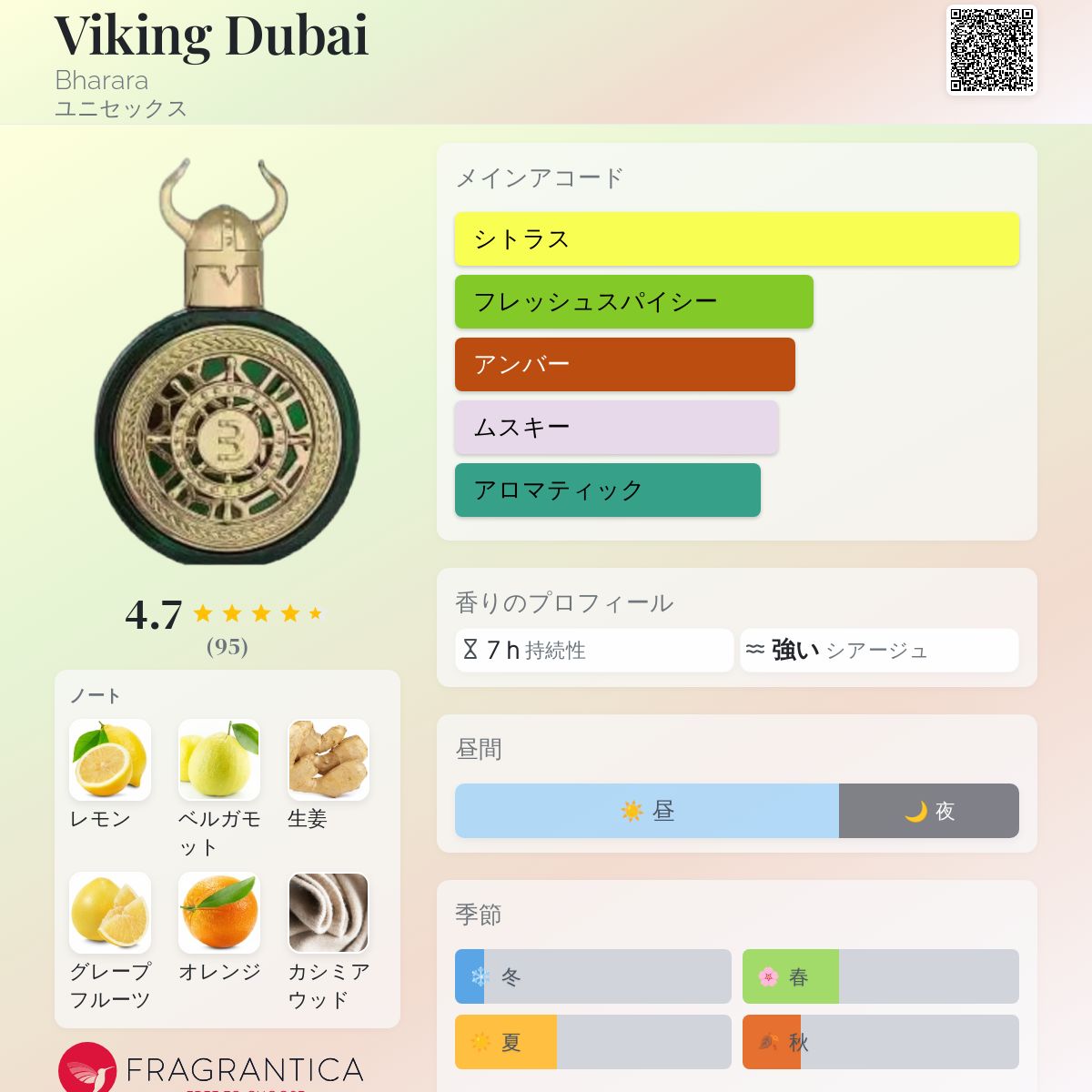 バイキング・ドバイは、まさに素晴らしい!その香りのピラミッドには、柑橘系のフレッシュな香調が、豊かさ、豪華さ、力強さ、洗練さ、高級感、そしてもちろん優雅さを伝えています。私のお気に入りのひとつになりました。バーララ社は(ほとんど)決して期待を裏切りません。