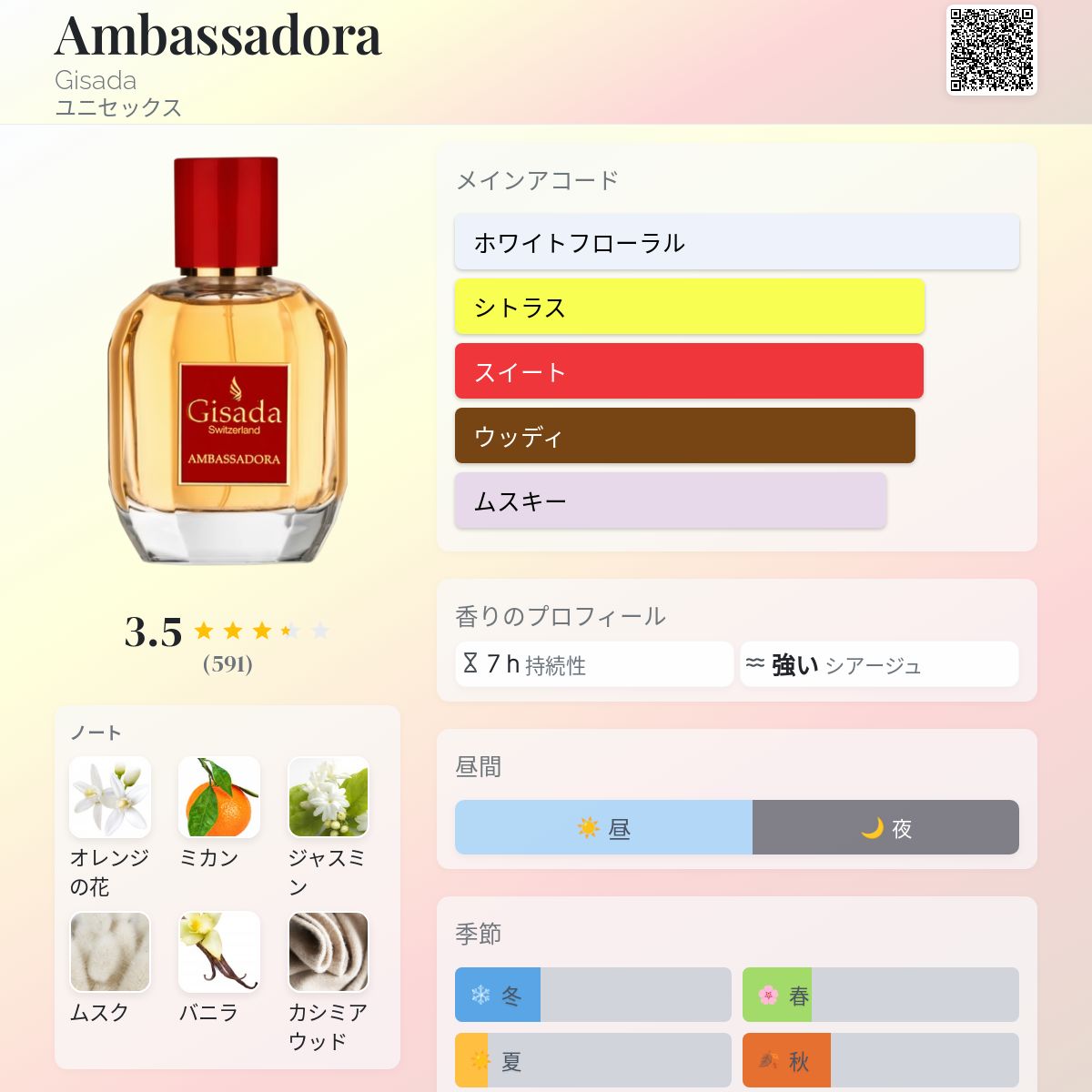 時計、チョコレート、ロジャー・フェデラーに続き、チューリッヒの企業Gisadaのおかげで、スイスは香水でも広く知られるようになりました。Ambassadoraは2021年に発売された女性用フレグランスで、その優雅さと甘さから短期間で大きな知名度を獲得しました。これらの特徴は、女性だけでなく、私の母を含む幅広い層から高く評価されています。 アンバサドラは、オリエンタルな影響が顕著なフルーティーでフローラルな香水です。トップノートは、熟した果実が溢れる緑豊かな庭園のイメージや記憶を呼び起こす、まさにフルーティーで輝かしい爆発のような香りです。その後、フローラルなハートノートが、非常に甘く繊細に、ロマンチックでエレガントなタッチを添えて、その香りを引き継ぎます。 バニラ、アンバー、ムスク、パチョリを基調としたベースは、包み込むような温かな感覚をもたらし、まるで夕方のくつろぎのひとときのような気分にさせてくれます。香りの旅は徐々に展開し、着用者の心に深い印象を残します。女性らしさと官能性のバランスが取れた、非常に汎用性の高い香りを好む、成熟した洗練された女性のためにデザインされた香水です。 そのバランスの取れた構成と洗練された甘さのおかげで、昼も夜も着用できます。暖かく包み込むようなノートが最もよく表現される秋や冬などの涼しい季節に最適ですが、フルーティーでフローラルなノートの爽やかさのおかげで、春にも安心して着用できます。 アンバサドラの持続性は非常に高く、長持ちするエレガントな香りを求める方に最適です。決して押し付けがましくならないのも魅力です。フローラルでフルーティな香りを好みながら、エレガントな温かさと官能性を求める方には、目隠し購入をお勧めします。