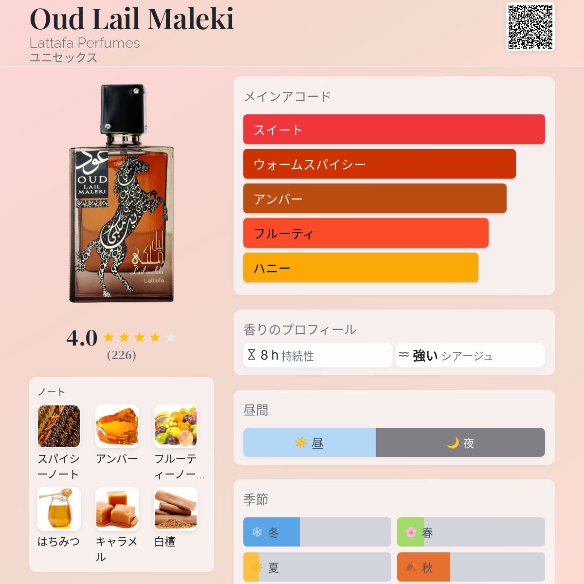 結論として、ウード・ライル・マレキは魅力にあふれた、抗いがたいオリエンタル系香水であり、午後遅く、夕刻、夜のイベントやお祝い事に非常に適している。間違いなく秋や冬の寒い季節、あるいは早春に着用すべき香水だ。 ただし夏場は除外したい。高温下では濃厚で甘すぎる調和が不快に感じられるためだ。香りの広がりと肌への持続性、両面で高いパフォーマンスを発揮する。大衆向けではないことは明らかだが、アラビアン系を好む方、存在感を放ち、際立ち、手頃で過小評価されている香りを求める方にお勧めしたい。